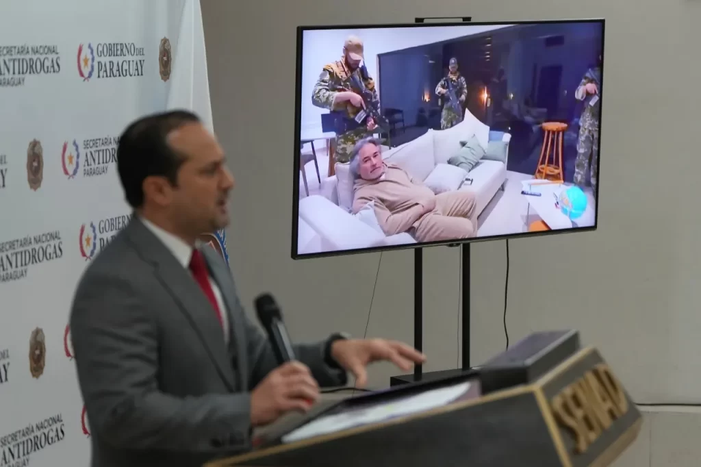El presidente de Paraguay, Santiago Peña, celebró durante el fin de semana la captura y compartió un video en sus redes sociales donde se ve cómo equipos de operaciones especiales tiraron abajo la puerta de una lujosa vivienda y lo detuvieron el viernes por la noche. En el lugar se localizaron celulares y tarjetas cuya información está bajo investigación.